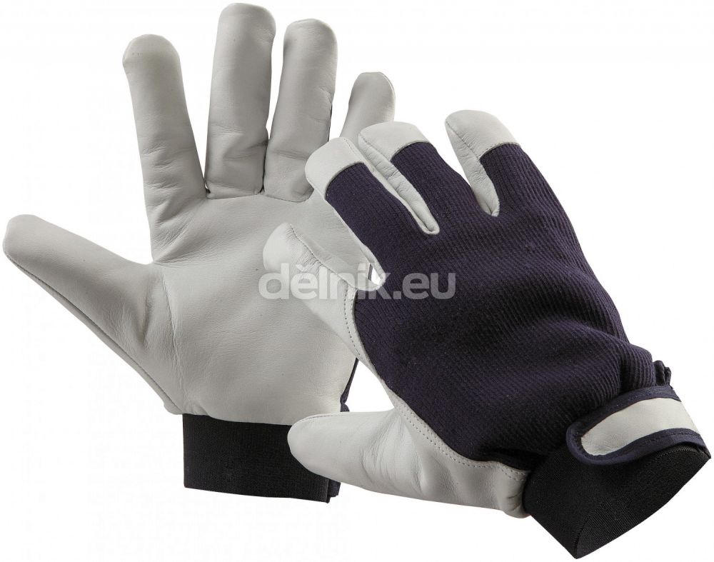Zateplené rukavice šité z jemné lícové kozinky v dlani, modré bavlněné tkaniny na hřbetu a s manžetou na suchý zip.