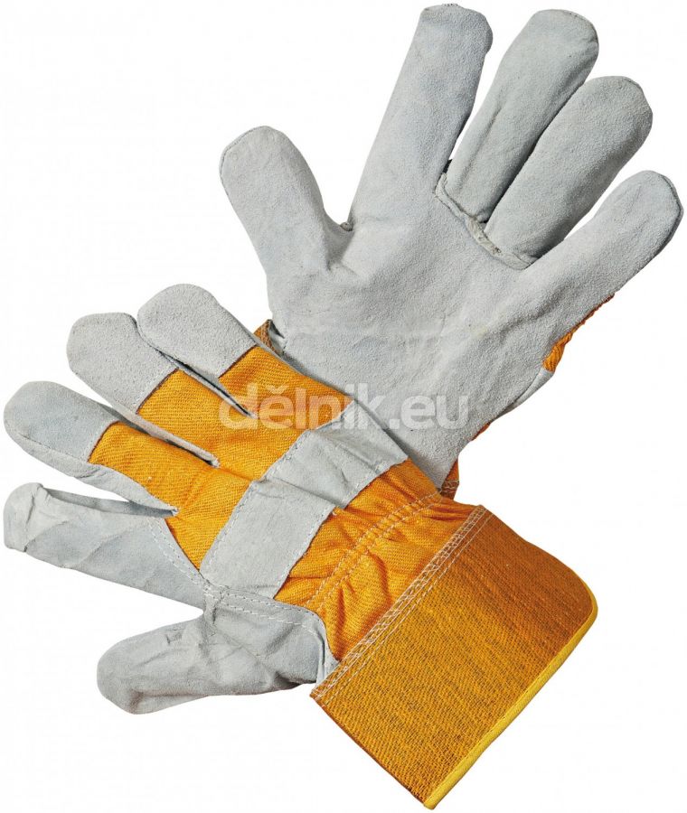 Rukavice vyrobené z jednoho kusu hovězí štípenky, v dlani s podšívkou, tkanina na hřbetu. Celokožené palce a překryté špičky prstů.