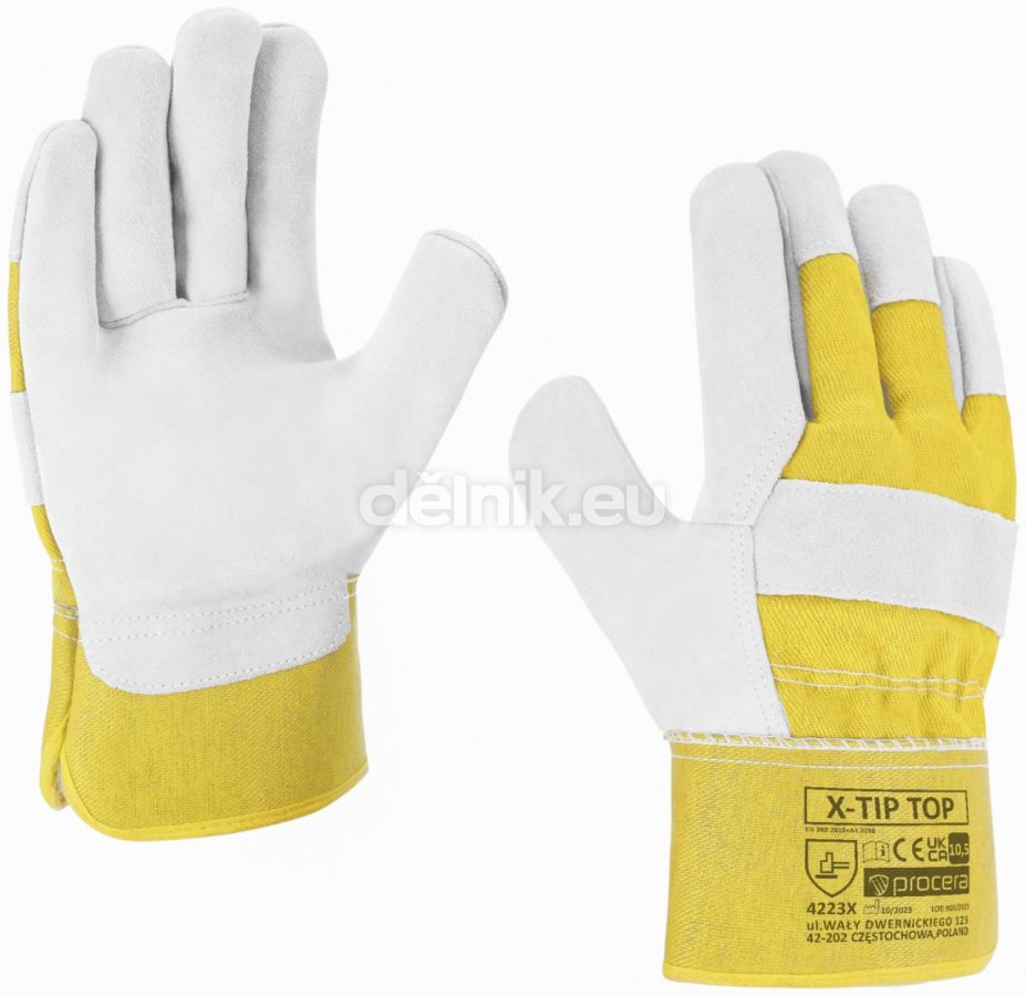 Pracovní rukavice vyztužené štípenkou, celodlaň, žlutá džínovina. Úchopová část je vyrobena z jednoho prvku kůže - štípané hovězí kůže v přírodní barvě. Elastický pás nad manžetou. Kožená výztuha na linii záprstních kůstek a konečků prstů. Pogumovaná džínová manžeta s paspulí.Vnitřní úchopová část je podšitá. EN 388
