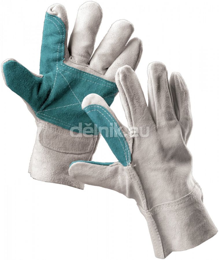 Rukavice z hovězí štípenky, zesílená dvojitá vrstva v dlani na palci a ukazovák a s 7 cm manžetou.