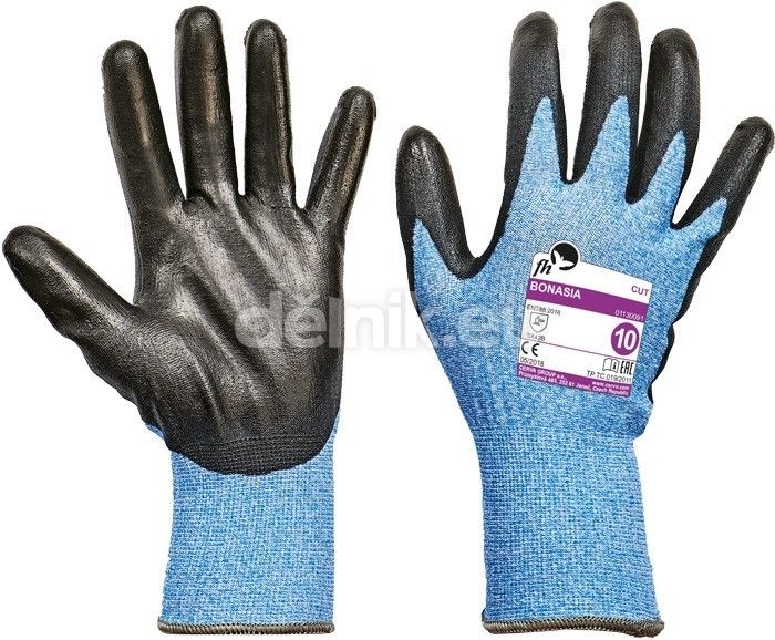 Pletené bezešvé rukavice kategorie prořezu 3, PU na dlani a na prstech, pružná manžeta.