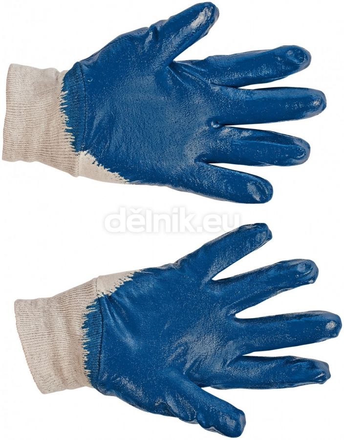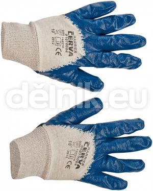 HARRIER pracovní rukavice máčené v nitrilu - Šitý bavlněný úplet polomáčený v nitrilu, pružný náplet na zápěstí, barva modrá, velikosti 7-10