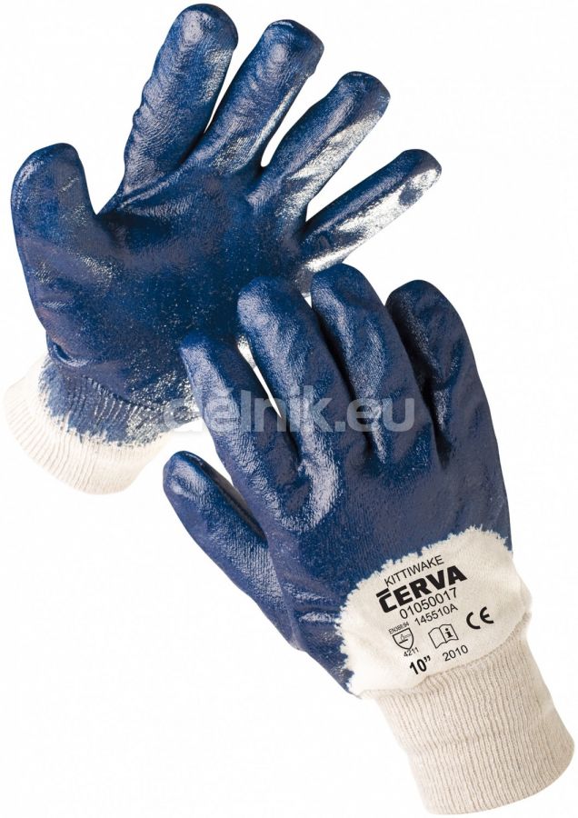 KITTIWAKE pracovní rukavice polomáčené v nitrilu - Šitý bavlněný úplet polomáčený v silné vrstvě nitrilu, pružný náplet na zápěstí, barva modrá, velikost 10