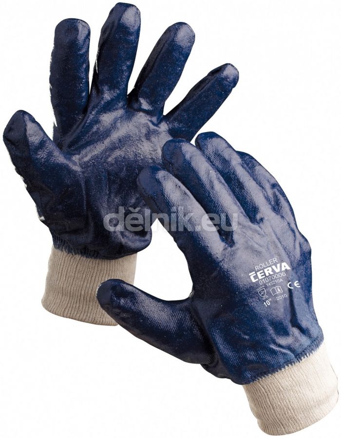 ROLLER pracovní rukavice celomáčené v nitrilu - Šitý bavlněný úplet celomáčený v silné vrstvě nitrilu, pružný náplet na zápěstí, barva modrá, velikost 10