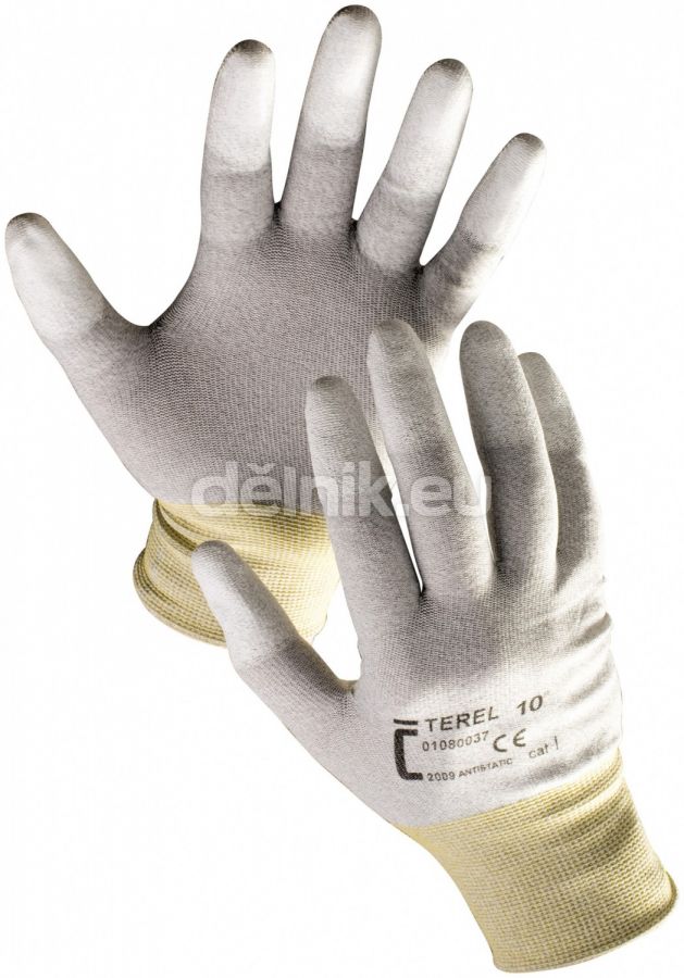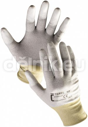 TEREL antistatické nylonové pracovní rukavice polyuretanovými (PU) prsty - Bezešvý úplet z šedého nylonu, integrované uhlíkové vlákno, pružná manžeta, velikosti 7 -10.