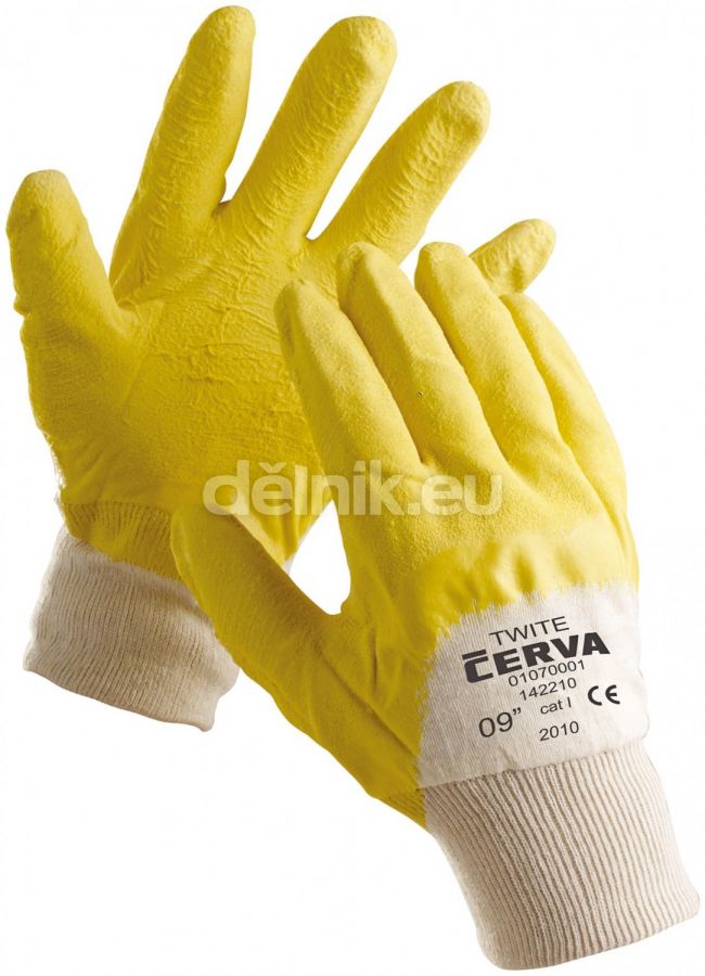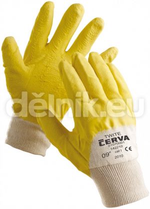 TWITE pracovní rukavice máčené v latexu - Šité bavlněné rukavice s pružným nápletem na zápěstí, polomáčené ve žlutém přírodním latexu, protiskluzová úprava povrchu dlaně a prstů, velikost 10