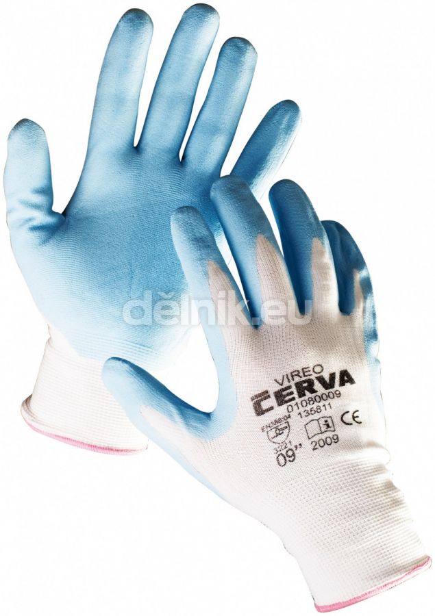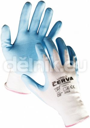 VIREO pracovní rukavice nylonové s nitrilovou dlaní - Bezešvý nylonový úplet povrstvený extra tenkým mikroporézním paropropustným nitrilem, pružný náplet na zápěstí, velikosti 7 - 10