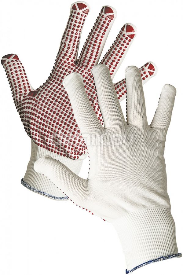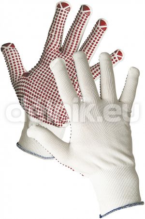GANNET pracovní rukavice nylonové s PVC terčíky - Bezešvý bílý nylonový úplet s pružným zápěstím, dlaň a prsty s červenými PVC terčíky, velikosti 7 - 12