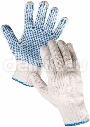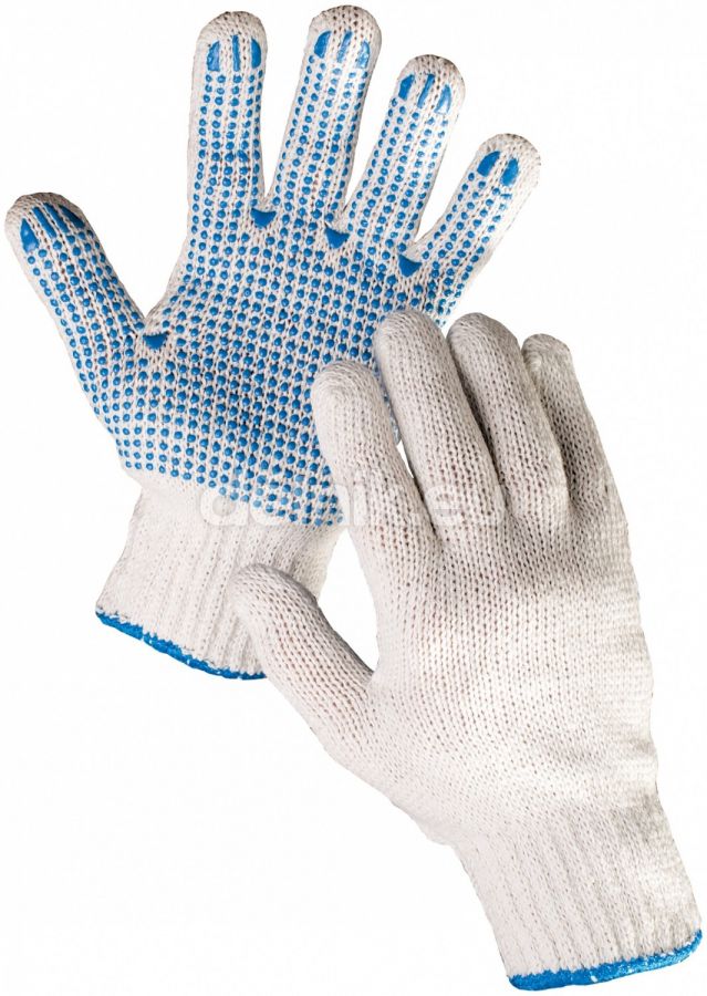 PLOVER pracovní rukavice TC s PVC terčíky - Bezešvý bílý polyester / bavlna úplet s pružným zápěstím, dlaň a prsty s modrými PVC terčíky, velikosti 9 a 10