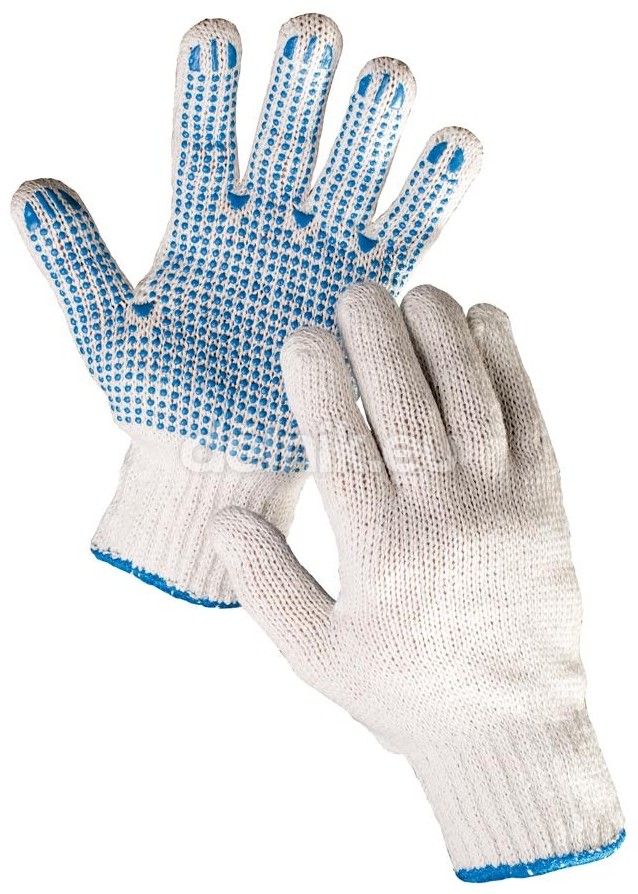 Pletené bezešvé rukavice ze směsi polyester/bavlna, s PVC terčíky v dlani a na prstech.