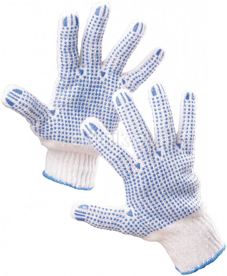 Pletené bezešvé rukavice ze směsi polyester/bavlna, s PVC terčíky v dlani, na hřbetu a prstech.