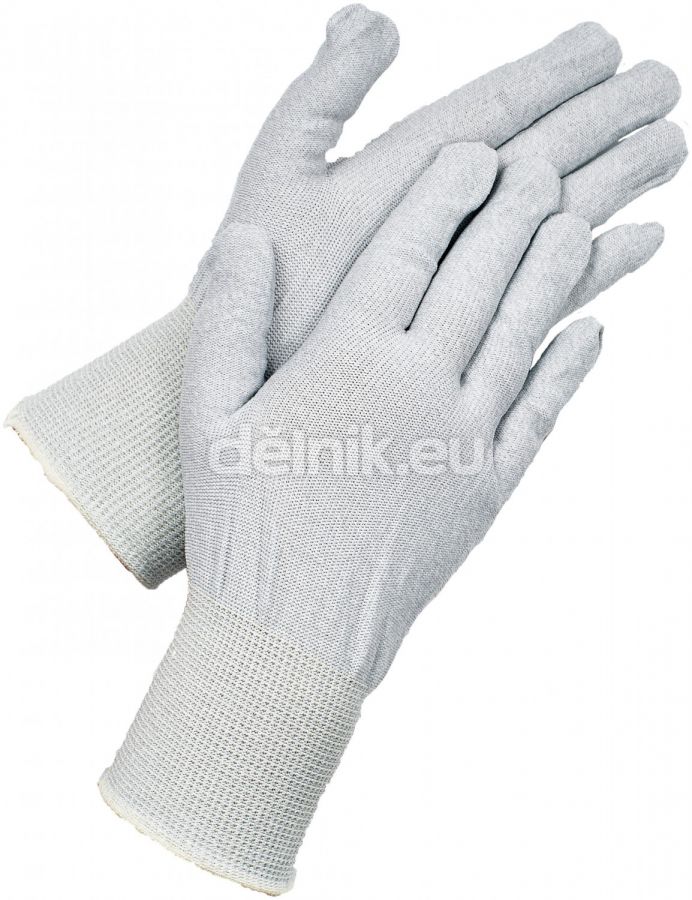 Pletené bezešvé antistatické nylonové rukavice, s karbonovými vlákny a elastickou manžetou. ESD.